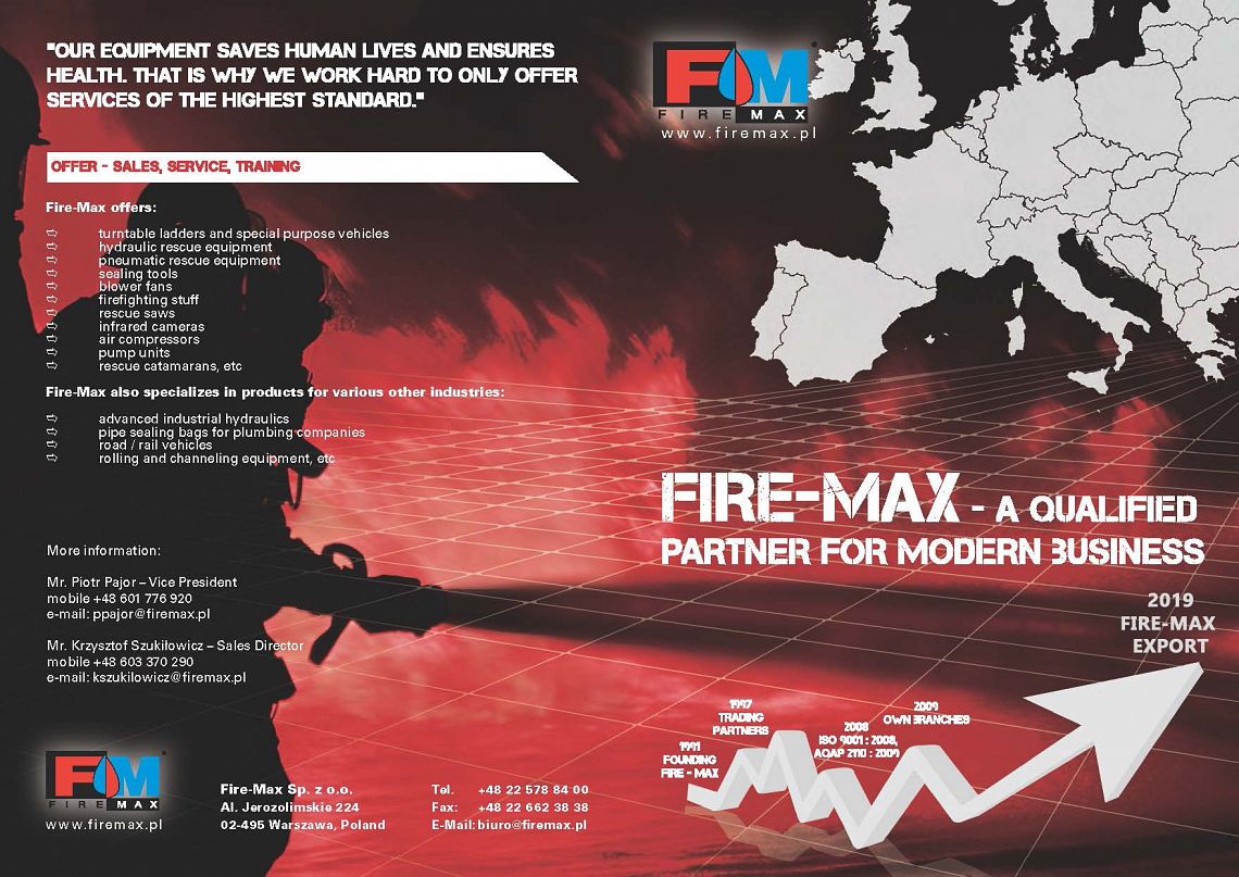 Fire-Max Sp. z o.o. - the fire industry leader in Poland, is a reliable international business partner with 30 years of experience. The company was founded in 1991 and from its beginnings it has focused on supplying specialized rescue equipment of world-recognized manufacturers to Polish fire brigades, police and army.