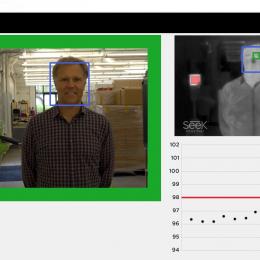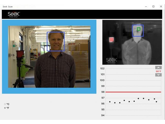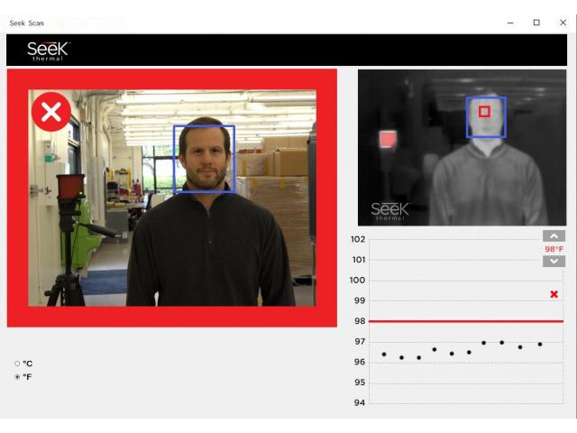 Unlike traditional screening methods SEEK SCAN enables social distancing and fully automatic operation. It scans and measures skin temperature once a human face is detected in the frame. High temperature i.e. fever triggers an alert.