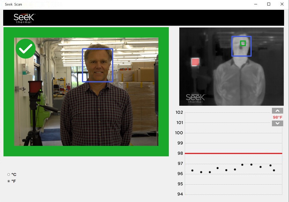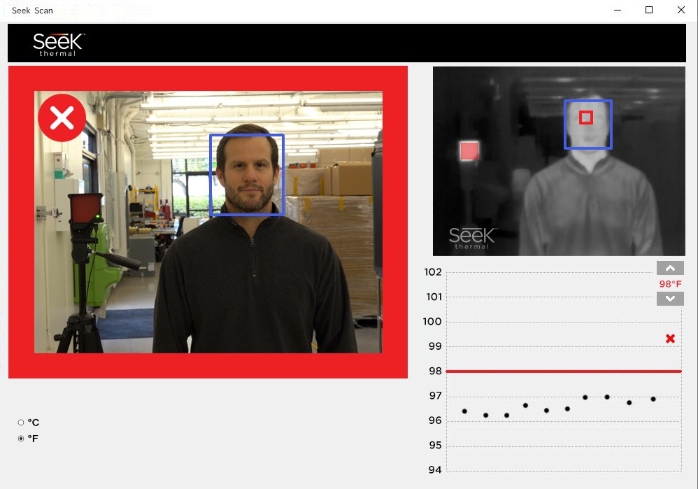 Unlike traditional screening methods SEEK SCAN enables social distancing and fully automatic operation. It scans and measures skin temperature once a human face is detected in the frame. High temperature i.e. fever triggers an alert.